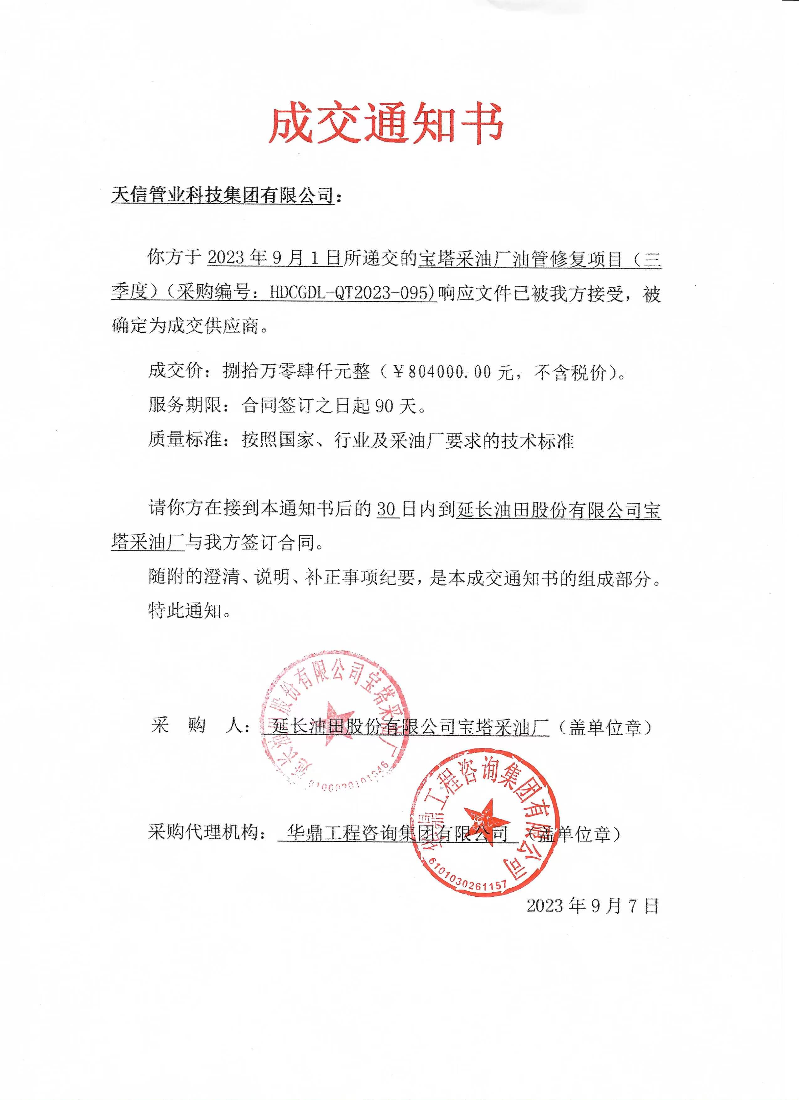 你方于2023年9月1日所遞交的寶塔采油廠油管修復項目(三季度)(采購編號:HDCGDL-QT2023-095)響應文件已被我方接受,被確定為成交供應商。