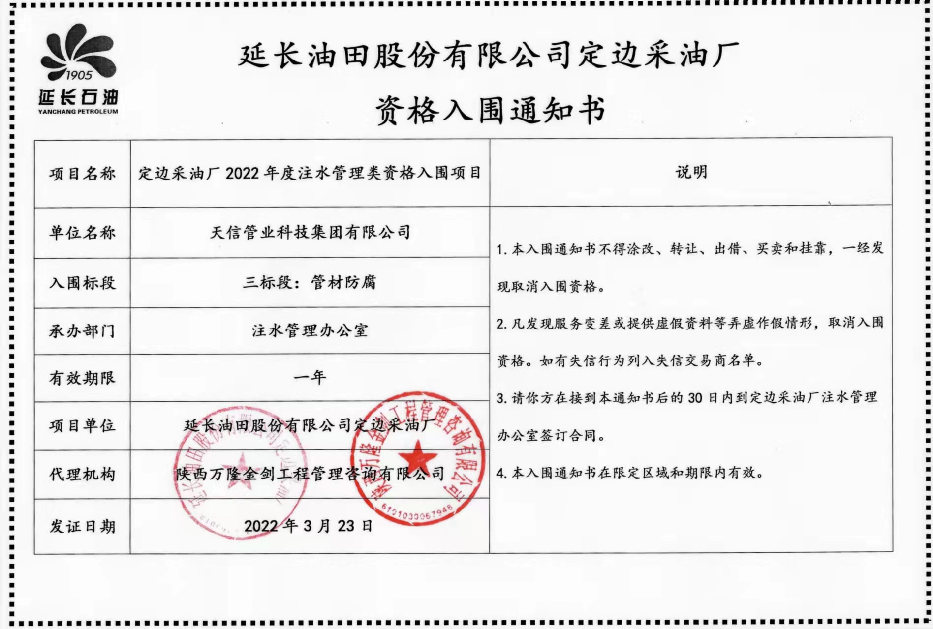 2022年3月10日,我公司投標(biāo)的定邊采油廠2022年度注水管理類資格入圍“第三標(biāo)段管材防腐”項目(項目編號YCDCZB2021-ZR-17),在11家公司參與的激烈競爭中以第一名的好成績成功入圍,這是公司實力的再次體現(xiàn),意味著我公司今后可以參與定邊采油廠注水管理類管材防腐項目的招標(biāo)、建設(shè),公司全體員工表示熱烈的祝賀,祝愿銷售部門再接再厲,為公司的發(fā)展再創(chuàng)佳績。也希望公司各部門振奮精神,團(tuán)結(jié)協(xié)作,推進(jìn)各項工作再上新的臺階。